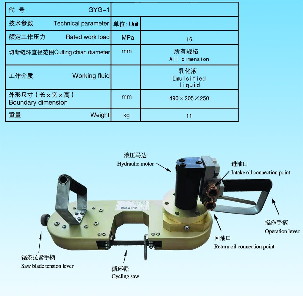 GYG-1型液压切割锯专门为 煤矿企业生产现场设计和制造的。其主要功能是为了锯断各种规格的圆环链链条及链环,还可锯断多种管材和型钢等。工作介质为乳化液。