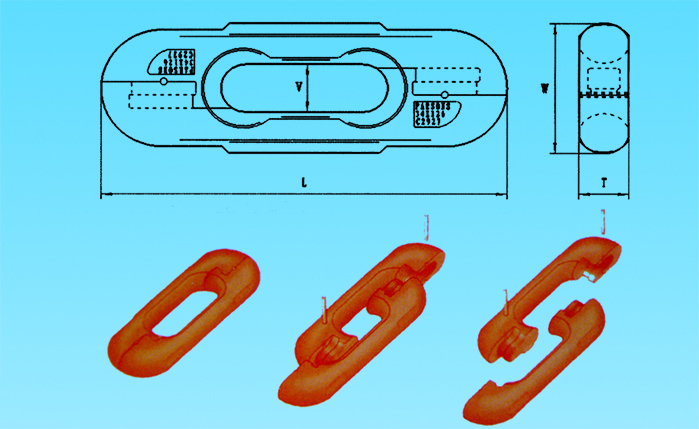 “V型锁”接链环是专门为连接圆环链和“紧凑”链而设计。因为在制造过程中选择了富含Cr、Ni、Mo合金元素的高合金钢原材料和多重热处理工艺,具有非常高的拉伸性能和疲劳寿命。