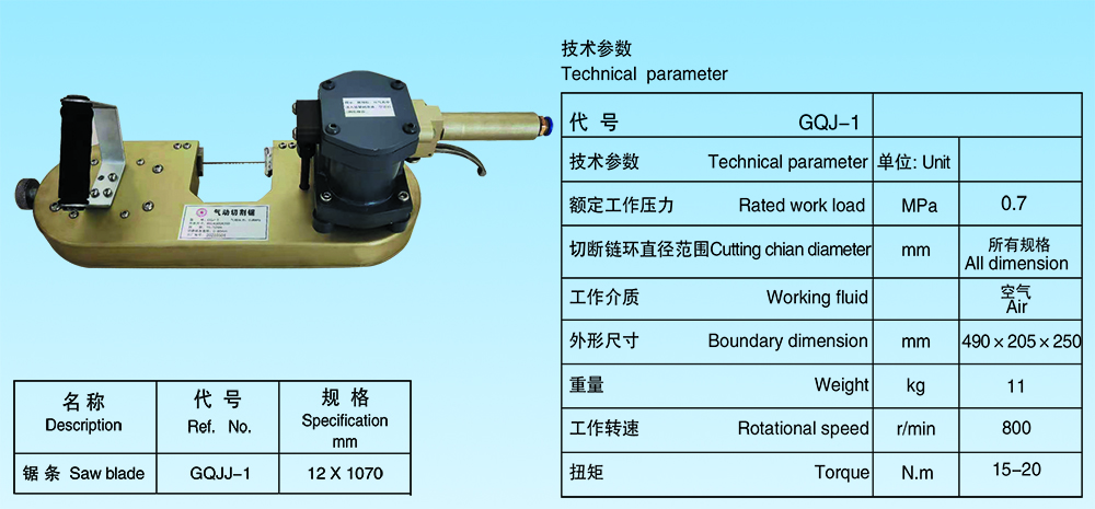 GQJ-1型气动切割锯专门为煤矿企业生产现场设计和制造的,其功能主要是为了锯断各种规格的圆环链链条及链环,还可锯断多种管材和型钢等。动力源为压缩空气。